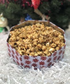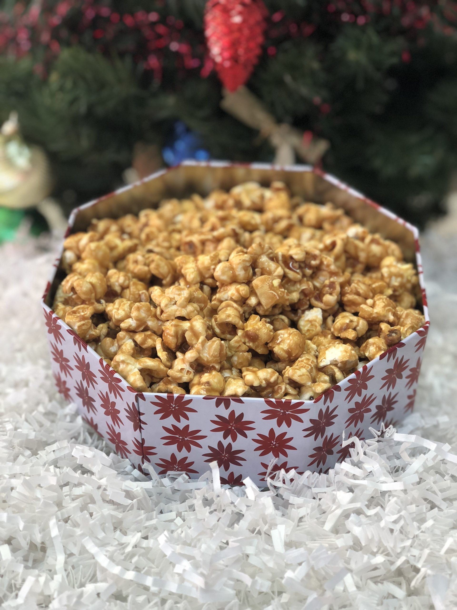 Laura’s Handmade Caramel Corn in a decorative Holiday Tin. The Perfect Gift idea for the Holidays. Packaged in a reusable decorative tin container. Our Caramel Corn has a Sweet, Buttery Caramel Taste.